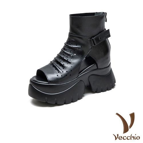 真皮頭層牛皮魚口沖孔皮帶釦飾鬆糕羅馬短靴 涼靴 黑*VECCHIO* |