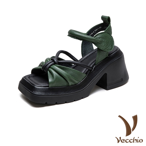 真皮頭層牛皮撞色方頭蝴蝶結防水台厚底高跟涼鞋 綠*VECCHIO* |