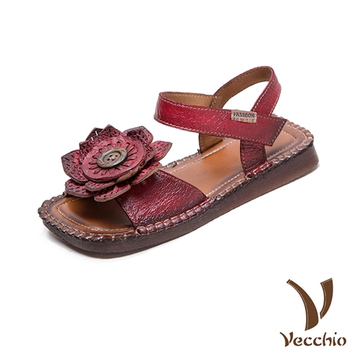 真皮羊皮立體太陽花朵舒適方頭平底涼鞋 紅*VECCHIO* |