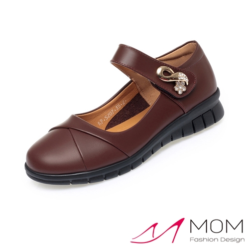 真皮氣質小圓頭舒適坡跟一字帶美鑽釦休閒娃娃鞋 棕*MOM* |