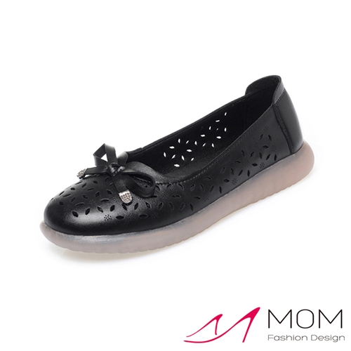 真皮菱格花朵縷空蝴蝶結舒適軟底鞋 黑*MOM* |