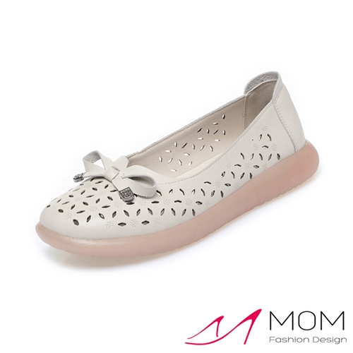 真皮菱格花朵縷空蝴蝶結舒適軟底鞋 米*MOM* |