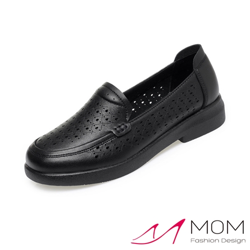 真皮透氣沖孔縷空舒適軟底低跟樂福鞋 黑*MOM* |