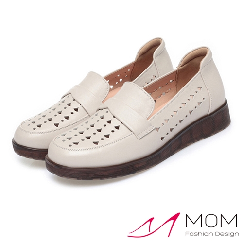 真皮幾何縷空沖孔一字帶舒適坡跟厚底樂福鞋 米*MOM* |