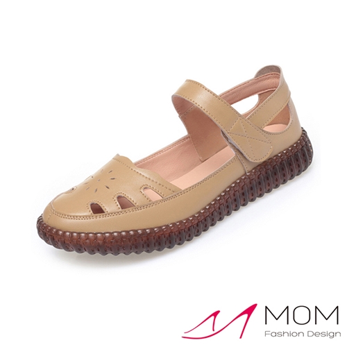 真皮舒適軟底縷空花邊魔鬼粘休閒涼鞋 杏*MOM* |