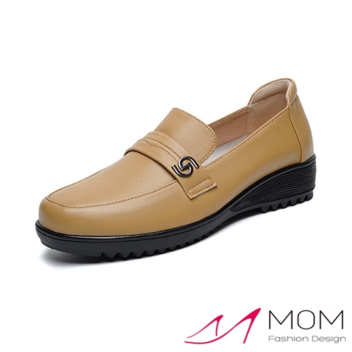 真皮典雅百搭金屬釦坡跟樂福鞋 卡其*MOM* |