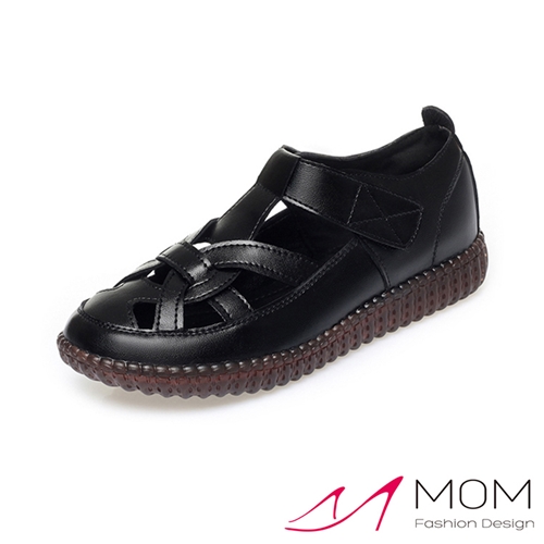 真皮縷空花結線條舒適軟底涼鞋 黑*MOM* |
