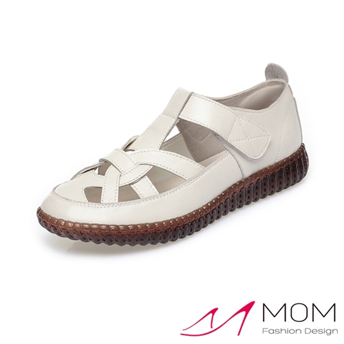 真皮縷空花結線條舒適軟底涼鞋 米*MOM* |