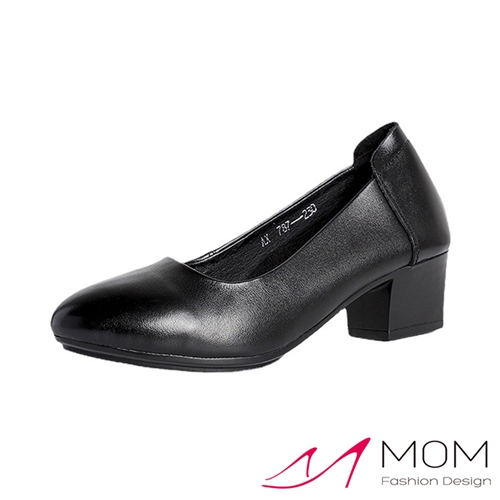 真皮頭層牛皮小尖頭淺口百搭舒適粗跟鞋 黑*MOM* |