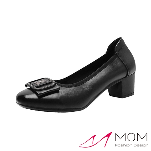 真皮頭層牛皮小圓頭時尚釦飾典雅粗跟鞋 黑*MOM* |