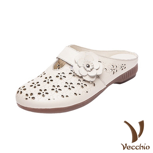 真皮頭層牛皮縷空花朵舒適低跟圓頭包頭拖鞋 2色任選*VECCHIO* |