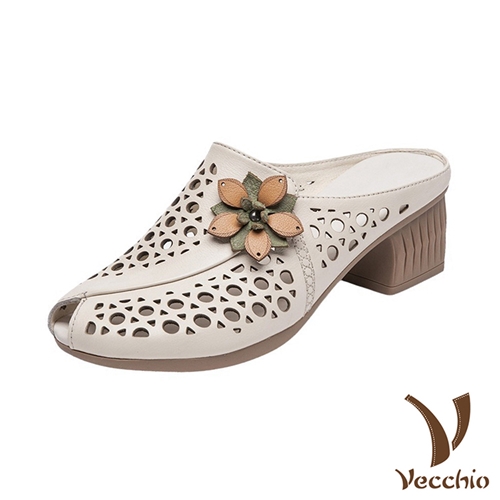真皮頭層牛皮幾何縷空立體花朵魚口粗跟涼鞋 2色任選*VECCHIO* |