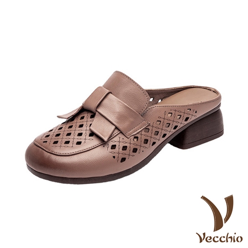 真皮頭層牛皮菱格縷空蝴蝶結粗跟包頭拖鞋 2色任選*VECCHIO* |