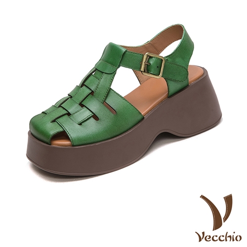 全真皮頭層牛皮復古編織縷空鬆糕厚底涼鞋 綠*VECCHIO* |