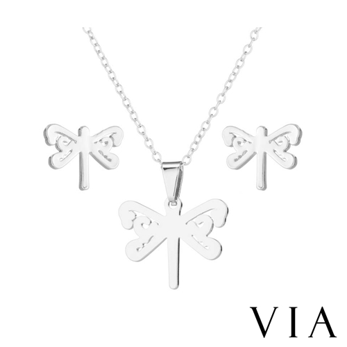 [快速出貨] 昆蟲系列 幾何花紋蜻蜓白鋼耳釘項鍊套組 鋼色*VIA* |