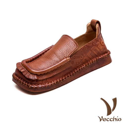 全真皮頭層牛皮手工立體滾邊方頭平底樂福鞋 棕*VECCHIO* |