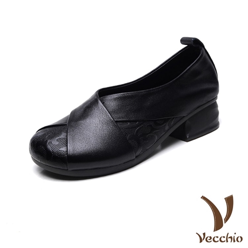 全真皮頭層牛皮皮雕交叉帶設計小圓頭粗跟鞋 黑*VECCHIO* |