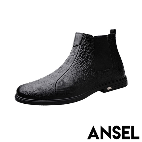真皮頭層牛皮鱷魚皮紋個性切爾西短靴 黑*ANSEL* |