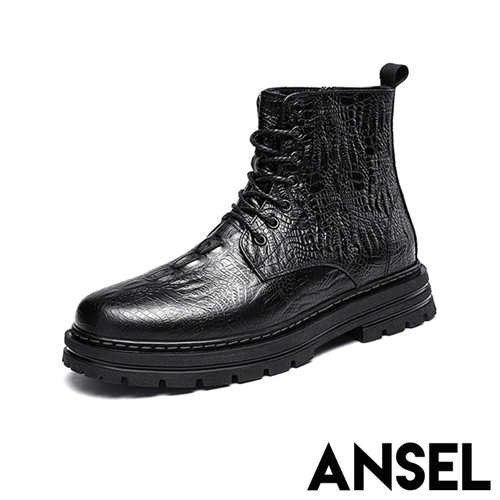 真皮時尚鱷魚皮紋設計繫帶休閒馬丁靴 黑*ANSEL* |