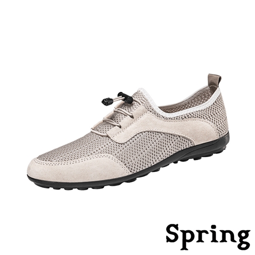 真皮透氣網布拼接束帶戶外休閒鞋 杏*SPRING* |
