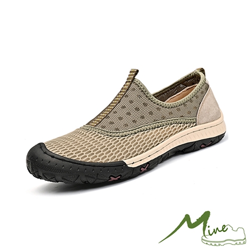 真皮3D網布拼接舒適休閒戶外徒步鞋 懶人鞋 卡其*MINE* |