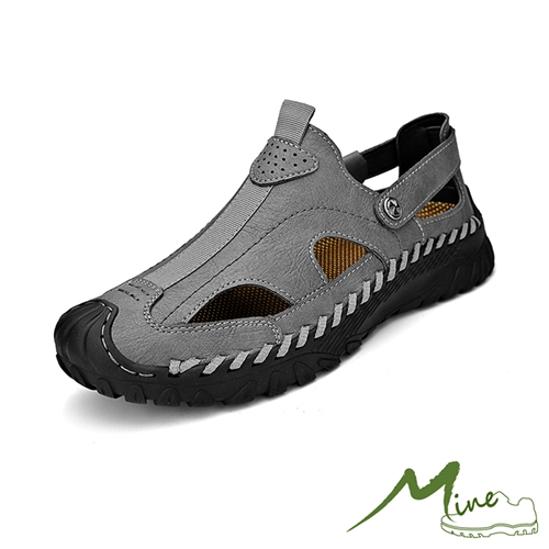 真皮手工縫線百搭縷空設計休閒登山徒步涼鞋 灰*MINE* |