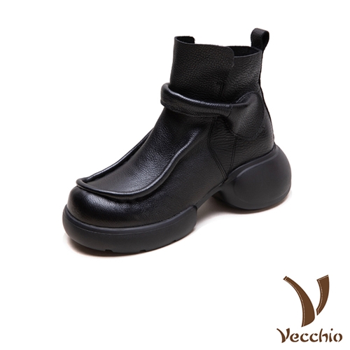 真皮頭層牛皮復古立體線邊包根一字帶厚底短靴 黑*VECCHIO* |