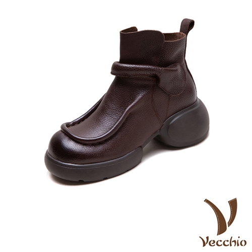 真皮頭層牛皮復古立體線邊包根一字帶厚底短靴 棕*VECCHIO* |