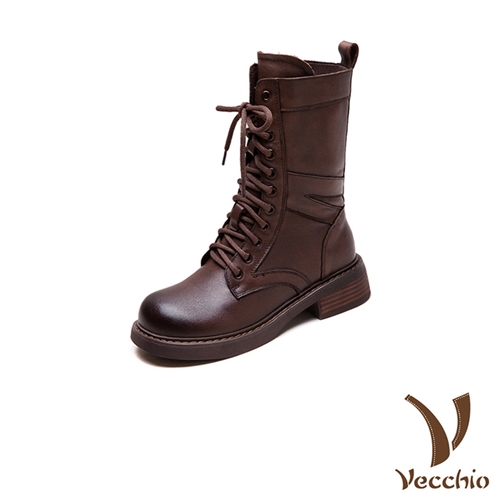 真皮頭層牛皮潮流拼接繫帶個性中筒馬丁靴 咖*VECCHIO* |