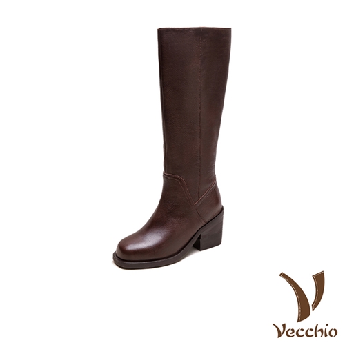 全真皮頭層牛皮百搭經典純色粗跟長靴 咖*VECCHIO* |