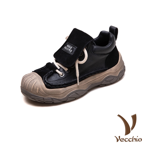全真皮頭層牛皮復古大鞋舌綁帶餅乾厚底休閒鞋 黑*VECCHIO* |