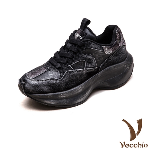 真皮頭層牛皮異材質復古拼接厚底休閒鞋 黑*VECCHIO* |