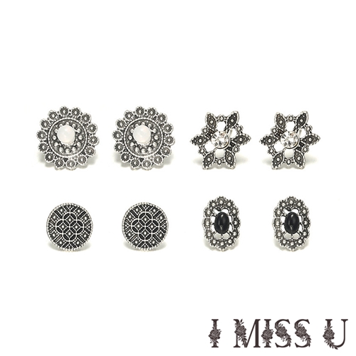 [快速出貨] 復古民族風縷空鑲嵌造型耳釘4對套組*I MISS U* |
