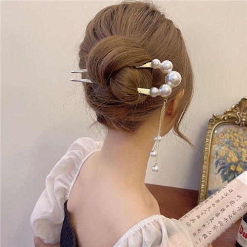 [快速出貨] 韓國設計復古珍珠流蘇鑲嵌U型盤髮髮簪*INES* |