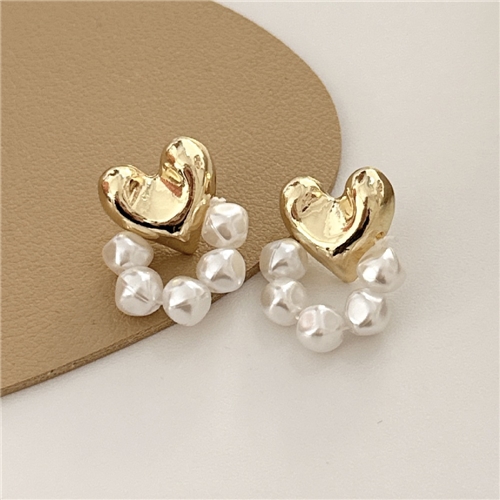 [快速出貨] 韓國設計S925銀針復古金屬愛心珍珠造型耳環*INES* |