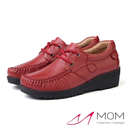 全真皮頭層牛皮手縫車線造型時尚坡跟休閒鞋 紅 |