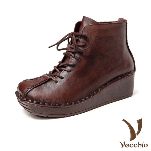 真皮頭層牛皮手工縫線綁帶舒適厚底坡跟復古短靴 棕 |