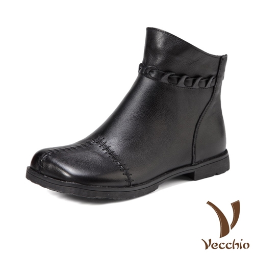 真皮頭層牛皮典雅編織花邊復古縫線寬楦舒適低跟短靴 黑 |