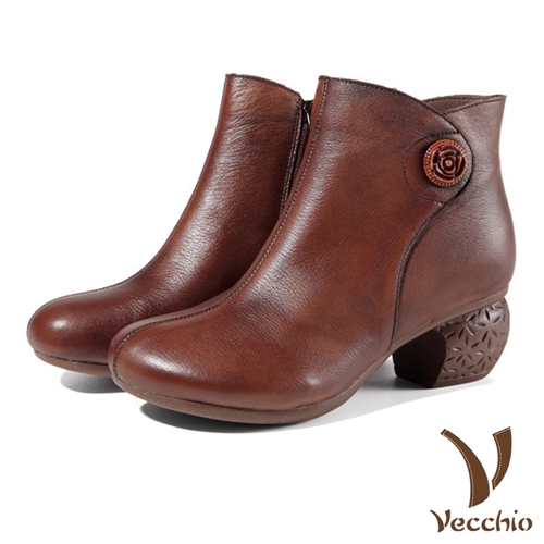 真皮頭層牛皮復古刻花玫瑰木釦舒適寬楦造型粗跟短靴 棕 |