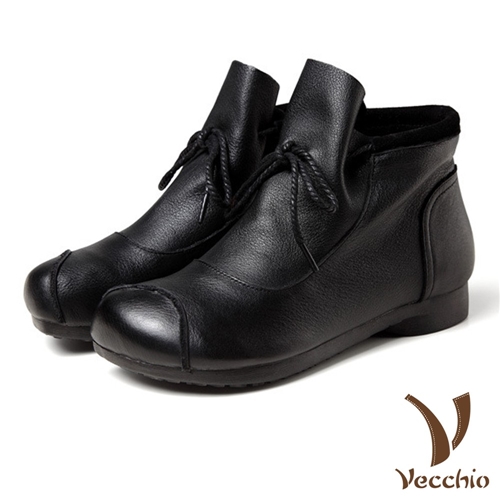 真皮頭層牛皮復古典雅舒適寬楦抽繩綁帶低跟短靴 黑 |
